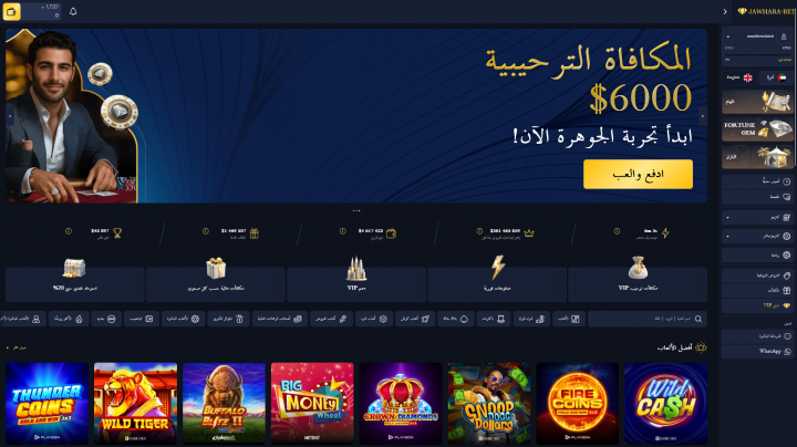 كازينو Jawhara اون لاين هو منصة ألعاب كازينو ومراهنات رياضية تأسس حديثًا ويعمل بشكل مرخص. يمتاز الكازينو بتصميم أنيق مع خلفية داكنة تمنحه لمسة من الفخامة مع سهولة التصفح وسرعة التحميل. يقدم كازينو جوهرة اون لاين حزمة ترحيبية للاعبين الجدد تصل إلى 1998 دولار و25 دورة مجانية مقسمة على الإيداع الأول الثاني. هذا إلى جانب مكافأة ترحيب مخصصة لكبار اللاعبين VIP والتي تصل قيمتها تصل 12000 دولار مقسمة على الإيداع الأول والثاني. في الحقيقة، نجد أن كازينو Jawhara اون لاين لديه ما يجذب به اللاعبين الجدد لتوسيع قاعدته الشعبية.