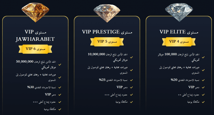 - مستوى VIP JAWHARABET: عندما يصل إجمالي المبلغ المودع في حسابك إلى 50 مليون دولار في حسابك، ستصل لهذا المستوى الذي يمثل أعلى مستويات برنامج مكافآت الولاء حيث تصل فيه نسبة الكاش باك إلى 30%.