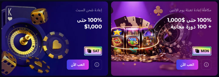 أثناء اختباراتنا للمنصة، لاحظنا اهتمام كازينو Lucky7even بتنشيط حسابات اللاعبين أسبوعياً عبر مكافآت إعادة شحن قوية تصل إلى 1,000 دولار لكل من عرضي الإثنين والسبت. يتطلب تفعيل هذه العروض إيداعاً بقيمة 50 دولارًا واستخدام الرموز الترويجية المخصصة (MON و SAT) للحصول على مكافأة مطابقة بنسبة 100%، وهذا يمنح المستخدمين سيولة إضافية تعزز من قدراتهم الشرائية، مما يتيح لهم فرصة أوسع للتعمق في تفاصيل مكتبة الألعاب الثرية واكتشاف تنوعها.