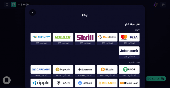 أقل مبلغ للإيداع10 دولارات10 دولارات20 دولارًا