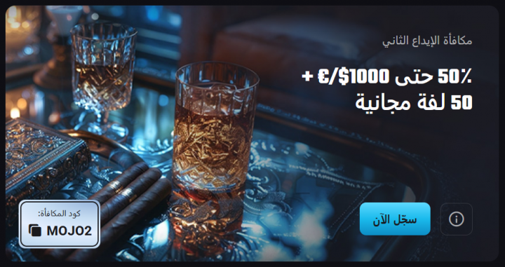- مكافأة الإيداع الثاني: يحصل اللاعب على مكافأة بنسبة 50% بحد أقصى 1,000 دولار، بالإضافة إلى 50 دورة مجانية، مع ضرورة إدخال الكود MOJO2.