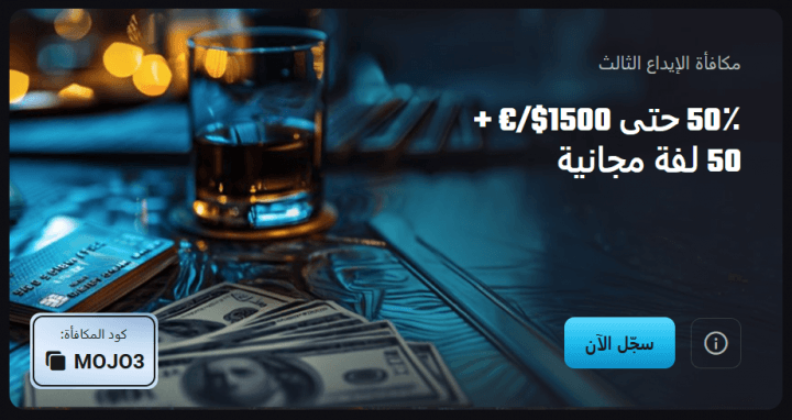 - مكافأة الإيداع الثالث: تمنح هذه المرحلة مكافأة بنسبة 50% تصل إلى 1,500 دولار، مع 50 دورة مجانية إضافية، ويتطلب ذلك إدخال الكود MOJO3.