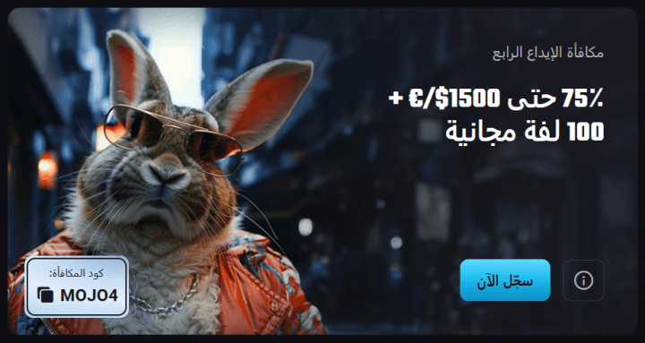 - مكافأة الإيداع الرابع: يُختتم العرض الترحيبي بمكافأة بنسبة 75% تصل إلى 1,500 دولار، مصحوبة بـ 100 دورة مجانية إضافية لتعزيز فرص اللعب، مع ضرورة إدخال الكود MOJO4.