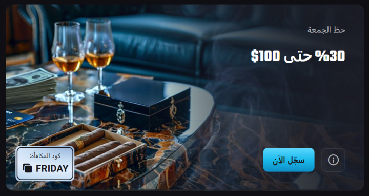 - حظ الجمعة: يقدم 30% حتى 100 دولارًا عند الإيداع بحد أدنى 20 دولارًا باستخدام الكود (FRIDAY).