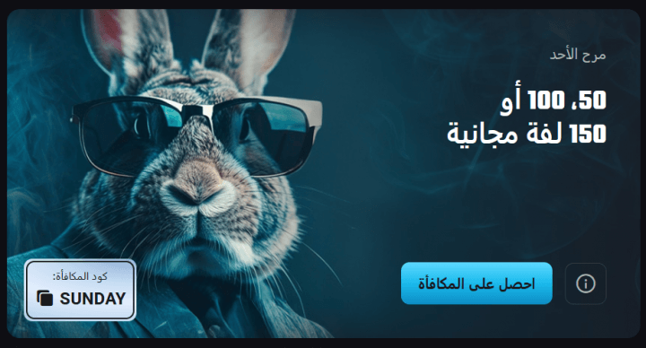 - مرح الأحد: يمنح دورات مجانية متدرجة تصل إلى 150 لفة عند الإيداع بحد أدنى 150 دولارًا باستخدام الكود (SUNDAY).