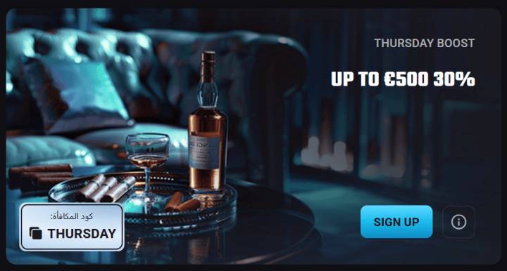 - تيربو الخميس: يوفر مكافأة بنسبة 30% تصل إلى 500 دولارًا عند الإيداع بحد أدنى 50 دولارًا باستخدام الكود (THURSDAY).
