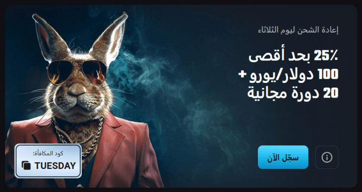 - مكافأة إعادة شحن الثلاثاء: تمنح 25% حتى 100 دولارًا مع 20 دورة مجانية عند الإيداع بحد أدنى 20 دولارًا باستخدام الكود (TUESDAY).