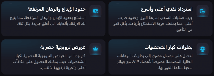 - معاملات مميزة: عمليات سحب أسرع وحدود إيداع أعلى.