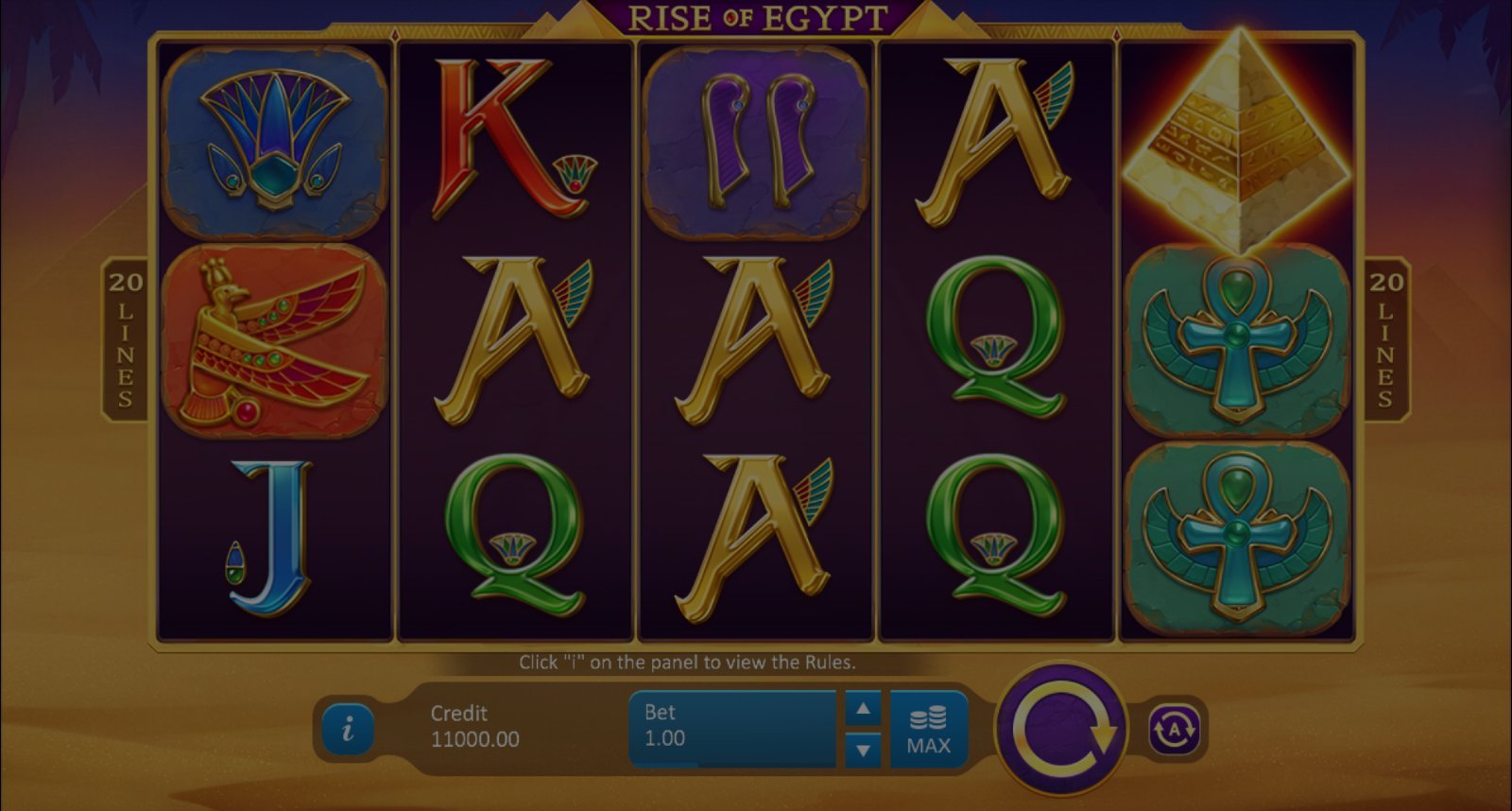 يتمحور موضوع لعبة سلوت Rise of Egypt حول الكتابة الهيروغليفية المصرية والأهرامات والصحاري الرملية.