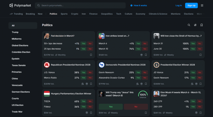 Political contracts rank among the most popular offerings. As campaigns unfold, these markets frequently produce forecasts that are more responsive to real-world developments than traditional polls: