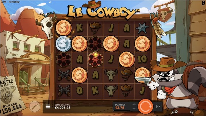 Le Cowboy differs from the rest of the slots in the series with a 6×6 grid. Plus, it replaces the Rainbow dependency with Revolver Cylinders, which are the Wild icons. They transform after wins and fire shots at random grid positions to reveal Coins, Diamonds, Clovers, Loot Bags, and Reload symbols. Three bonus rounds escalate through High Noon Saloon, Trail of Trickery, and the Pistols at Dawn Hidden Epic Bonus. Each of these adds another layer to the Revolver mechanic.