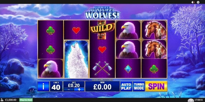 The wolf comes in stacks of 2, 3, 4 and 5. Then there is a wild symbol that joins him helping to link up to other symbols as well as being very useful in linking together multiple line wins via the stacked wolf symbol. The wild symbol and the wolf are the two highest paying combinations too!