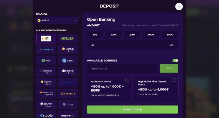 The minimum deposit is 20 EUR / 30 CAD. As for payment options available to you, you can choose to use Visa, Mastercard, Noda, Mifinity, Open Banking, Rapid Transfer, Interac, Neosurf, Jeton, Muchbetter, Flexepin, CoinsPaid, and other cryptocurrencies.