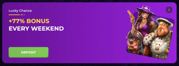 - Weekend Lucky Chance Bonus: On Fridays, Saturdays, and Sundays, there is a 77% deposit match up to 450 EUR / 450 USDT / 680 CAD.
