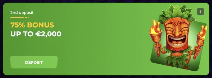 - Second Deposit: 75% up to 450 EUR / 680 CAD (Promo Code - WELCOMEBONUS2)