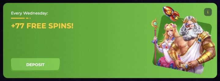 - Free Spins Every Wednesday: Deposit and earn 77 free spins every week with a maximum bonus amount of 150 EUR / 150 USDT / 225 CAD.