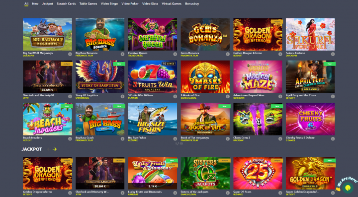 We found most of our favourites here, including titles such as Sugar Rush, John Hunter and the Book of Tut Megaways, and Wanted Dead or a Wild. We recommend you play those hard-hitting slot games if you register an account here. Razor Shark is another. Plus, if you want a chance to win big, you will find some fabulous jackpots in the Mega Moolah, WowPot, and Dream Drop jackpot ranges.