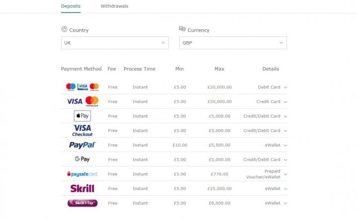 Visa/Mastercard, Bank Transfers, PayPal, Paysafecard, Skrill, and Neteller are your main options for withdrawals but you can also get paid out in cheque too. Again, there are no fees when making withdrawals no matter which payment method used. The minimum withdrawal amount is £5 for all payment methods except Paypal and Neteller at £10, and cheques which require a minimum of £100.