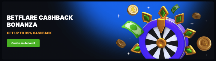 - Betflare Cashback Bonanza: Up to 35% Cashback is credited to all player accounts every Monday, based on net losses the previous week and the player's current loyalty level. It comes with 20x wagering requirements, and winnings are capped at 10x the amount received.