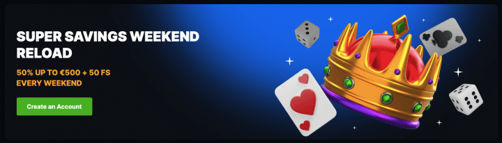 - Super Savings Weekend Reload: For a minimum deposit of €25 / A$20 / C$40 / NZ$50 between Friday and Sunday each week, players can unlock a 50% up to €500 / C$815 / A$890 / NZ$1,000 match deposit bonus and 50 free spins.