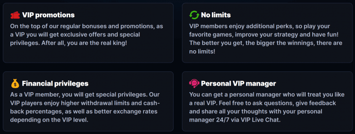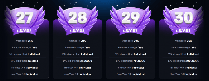 Adding to that, as you climb the program’s 30 tiers, you’ll unlock additional benefits, including increased withdrawal limits, birthday and New Year gifts, and a personal VIP manager.