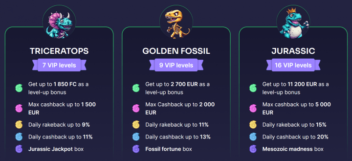 BinoBet uses a tier-based VIP system with five main levels, starting at Hatchling and ending at Jurassic. You move up by wagering, and higher levels unlock better rewards.