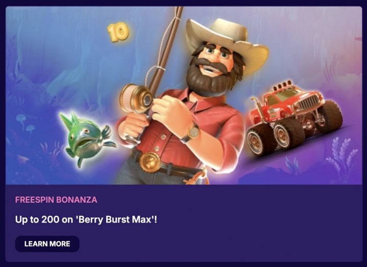 - Free Spin Bonanza (AU Only): Once a week, a free spins reload offer gives free spins equal to your deposit up to a maximum of 200. For example, a minimum deposit of A$25 gives you 25, while you’ll get 100 free spins if you fund your account with A$100. The spins are for the Berry Burst slot, and any winnings they bring you must be wagered 15x within two days.