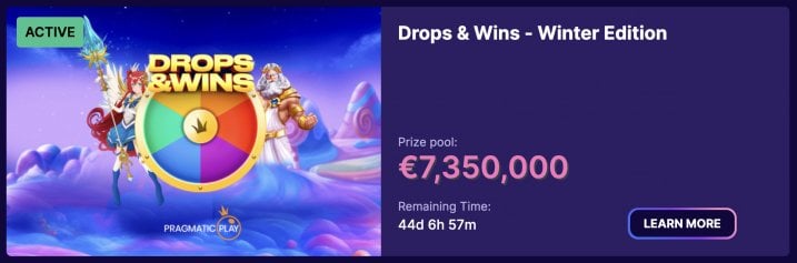 - Tournaments: The tournaments page hosts Pragmatic Play’s Drops & Wins promotion, featuring weekly leaderboard tournaments and prize drops. Furthermore, if you win a prize from any of the promos, the casino pays your winnings in cash with 0x wagering.