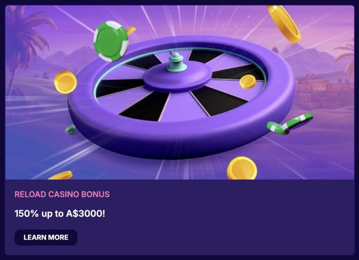 - Reload Casino Bonus (AU / NZ Only): Players in Australia and New Zealand can take advantage of a substantial reload bonus that can be claimed an unlimited number of times. In return for a A$25 minimum deposit, you’ll receive a 150% match up to A$3,000. The rollover is 35x (deposit + bonus), which must be met within seven days.