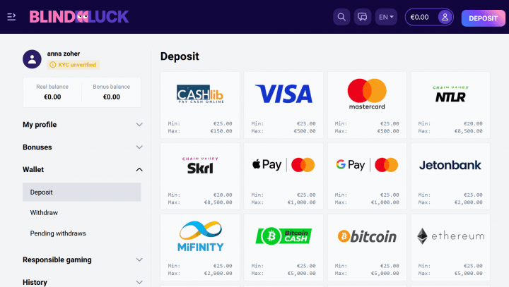 The minimum deposit required to get started at BlindLuck is €20 / C$20 / A$20 / NZ$20, which falls in line with most other online gambling platforms. Funds land in the real money balance in your casino account instantly and are fee-free.