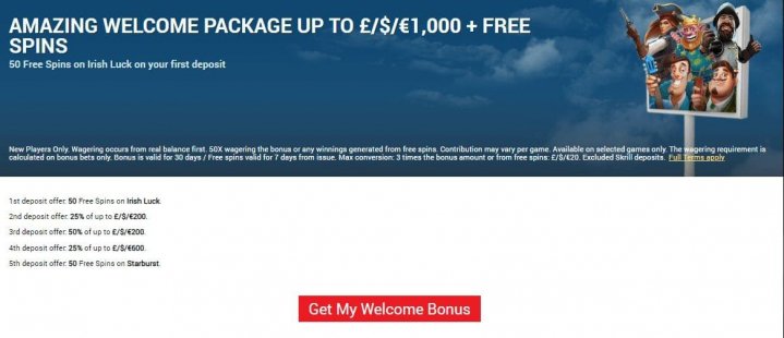 The welcome bonus looks attractive yet the wagering requirements are quite high, which we will get into below. The overall deal is €/£/$1,000 50 free spins on Irish Luck and another 50 free spins on Starburst. To take advantage of the entire deal, you will need to make 5 deposits, but you cannot use Skrill as a deposit method to claim this bonus.