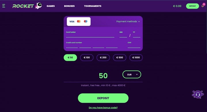 The payment system at Casino Rocket is modern, mixing traditional banking methods with cryptocurrencies. The available options include: