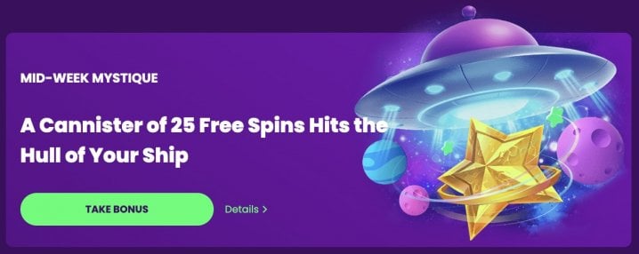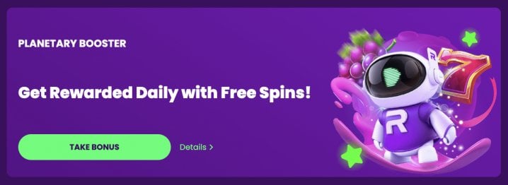 - Planetary Booster: Spin the Space Wheel for 10 to 30 free spins. To qualify, you must have deposited at least 20 EUR / 30 CAD / 30 AUD / 30 NZD the day before. The offer has a 45x rollover and a 50 EUR / 75 CAD / 75 AUD / 75 NZD withdrawal cap.
