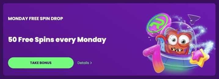 - Monday Free Spin Drop: Receive 50 free spins on Monday if you deposited at least 20 EUR / 30 CAD / 30 AUD / 30 NZD the week before. A 45x requirement and a 50 EUR / 75 CAD / 75 AUD / 75 NZD limit apply.