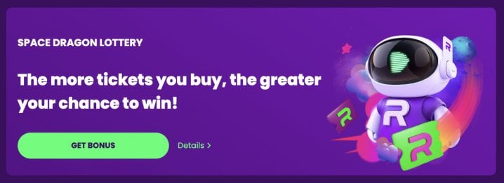 - Space Dragon Lottery: Get one ticket for every 20 EUR / 30 CAD / 30 AUD / 30 NZD deposited. Prizes are bonuses with a 20x requirement and a 100 EUR / 150 CAD / 150 AUD / 150 NZD withdrawal cap.