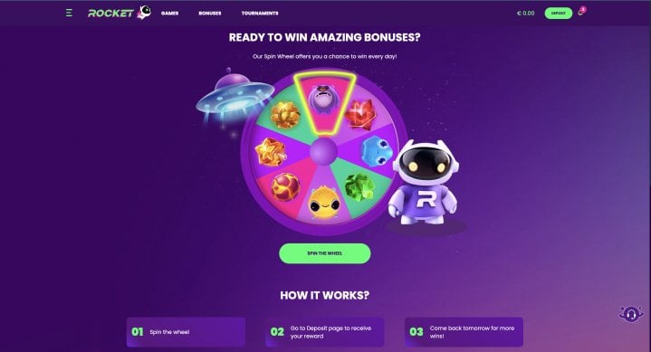- Spin Wheel: Get up to three daily bonuses with a deposit of at least 10 EUR / 15 CAD / 15 AUD / 15 NZD. If you deposit 50 EUR / 75 CAD / 75 AUD / 75 NZD or more, you receive 25 free spins with no wagering requirements.