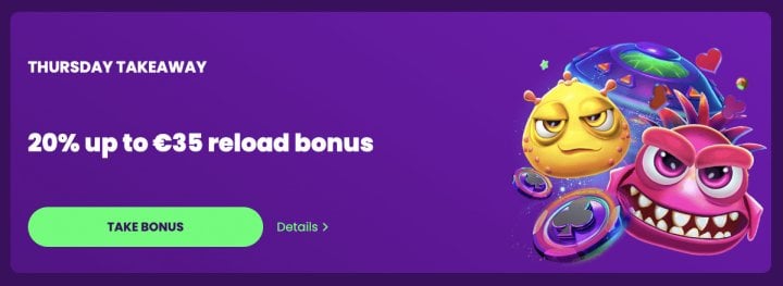 - Thursday Takeaway: Get a 20% match up to 35 EUR / 50 CAD / 50 AUD / 50 NZD when you deposit 10 EUR with the code “THURSDAY.” You can use this code up to 10 times, and it carries a 45x rollover.