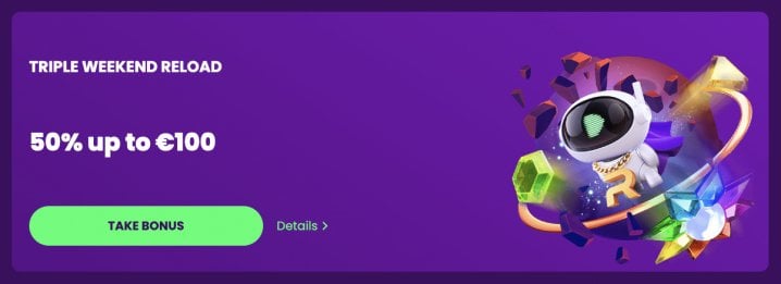 - Triple Weekend Reload: From Friday to Sunday, you can claim a 50% match up to 100 EUR / 150 CAD / 150 AUD / 150 NZD on a deposit of 20 EUR / 30 CAD / 30 AUD / 30 NZD. It has a 45x wagering requirement and a max withdrawal of 250 EUR / 375 CAD / 375 AUD / 375 NZD.