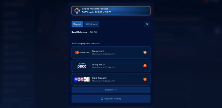 Minimum deposits are also consistent when claiming the first, second, and third stages of the new player bonus. At the cashier, select the deposit match offer, choose your payment method, and set the amount to €20 / C$30 / NZ$40 / A$30 or more to qualify.