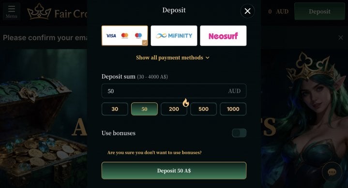 The minimum withdrawal for fiat methods is A$30 / NZ$20. The finance team at Fair Crown processes withdrawal requests within 72 hours.