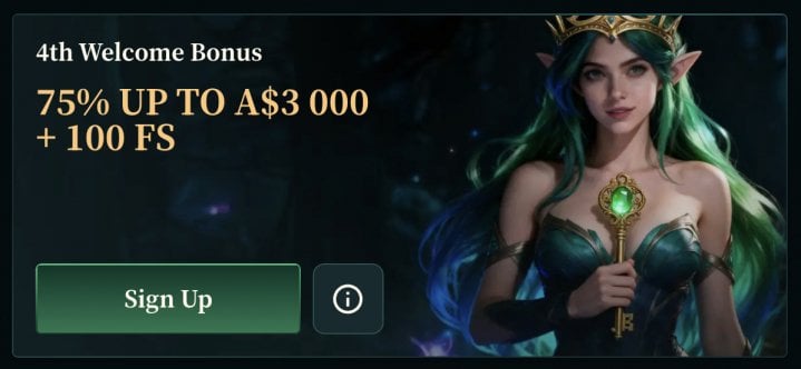 - Fourth Deposit: 75% match up to A$3,000 / NZ$3,000 + 100 FS on Fortune of Olympus