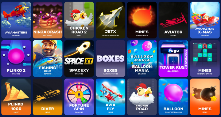 The crash and instant games section features Aviator, JetX, Mines, Plinko 2, Chicken Road 2, Ninja Crash, SpaceXY, Fishing Club, Boxes, Balloon Mania, and BGaming's Aviamasters series. It's a well-stocked category for players who prefer faster gameplay over traditional slots. One important note: instant game bets count 0% toward bonus wagering – keep that in mind if you have an active bonus running.