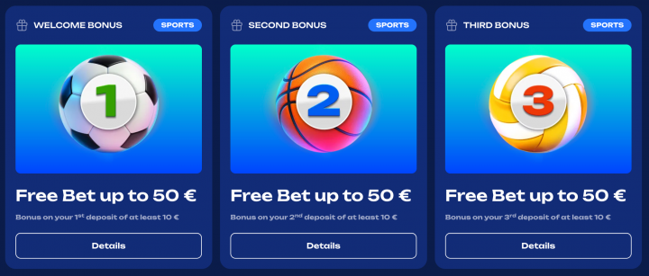 In addition to the casino welcome bonus, Fugu offers a dedicated sports welcome package. New players can receive three separate free bets of up to €50 each across their first three deposits (minimum deposit required).
