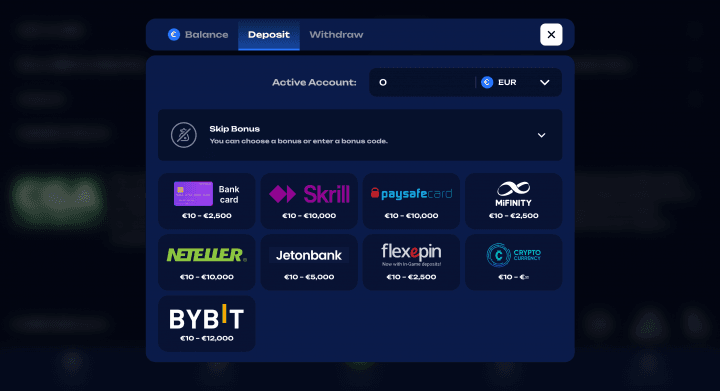 The bank card cap of €500 is low for players who want to make larger single deposits – Bybit or crypto are the only realistic options for bigger amounts. All balances display in EUR only.