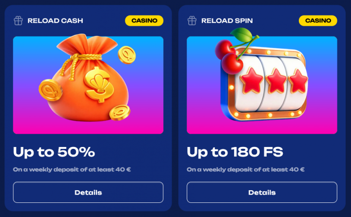 - The Reload Cash: Bonus scales from 20% at €40 up to 50% at €150+, capped at €400.