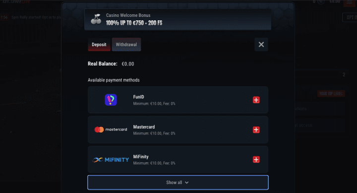 The minimum deposit for most methods is 10 EUR / 15 CAD / 15 AUD / 20 NZD, while Bitcoin deposits require a higher minimum of 30 EUR / 45 CAD / 45 AUD / 60 NZD. Crypto clearly takes priority at Glorion, with USDT available on multiple networks to help players reduce transaction fees. Traditional players may notice the absence of Visa as a payment option.