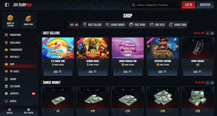 The Glorion Shop lets you turn your gameplay into direct rewards. You earn Coins by wagering, depositing (you get 5% of your deposit value back in Coins), and completing challenges or tournaments.