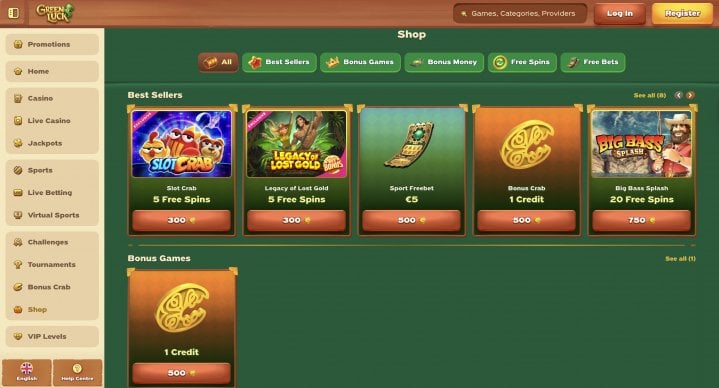 - Bonus Crab: The bonus crab comes with promotions via the bonus shop or deposits. It’s a virtual version of the fun arcade crab machines where you win a prize. On GreenLuck, the crab can grab free spins, bonus shop coins, bonus money, free bets, or even cash with 0x wagering. The deposit to claim a bonus crab is 10 EUR/USD, 15 CAD/AUD, or 20 NZD.