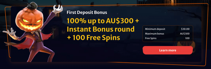 - 1st Deposit: 100% up to A$300 + Instant Bonus Round + 100 FS