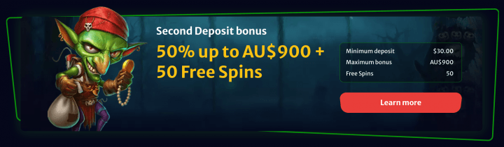 - 2nd Deposit: 50% up to A$900 + 50 Free Spins